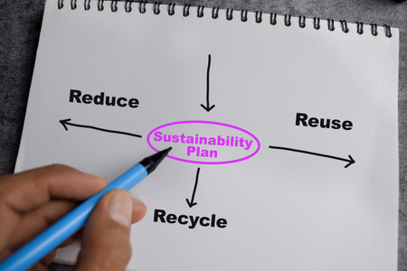 Concept of Sustainability Plan write on book with keywrods isolated on Wooden Table.