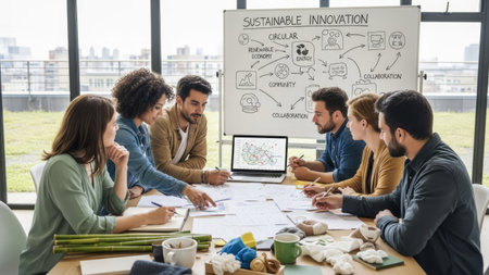 A diverse team collaborates on innovative business solutions in a modern workspace. Green elements and charts highlight a focus on sustainability and growth strategies.