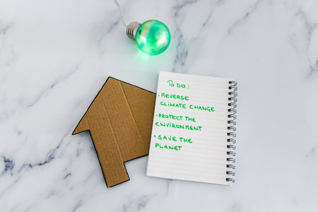ecology and green ideas for the environment conceptual image, green light bulb next to to do list to save the planet and house icon