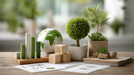 A green globe with wooden block and eco friendly plant on wooden table showing sustainable busines growth and environmental responsibility concept