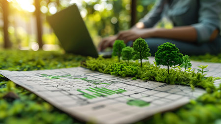 An overhead view of a landscape architect analyzing garden design plans amidst a lush green setting. AIG41