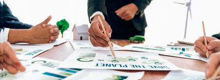 Diverse group of business people planning business marketing investment with eco-friendly policy for greener ecology. Productive teamwork contribute natural preservation and sustainable future. Quaint