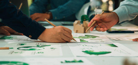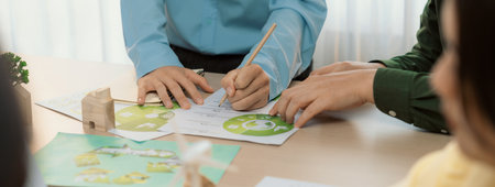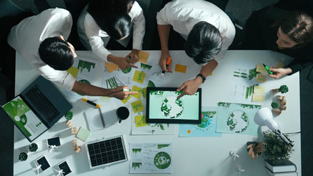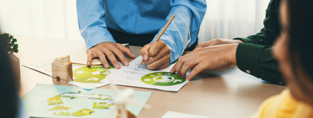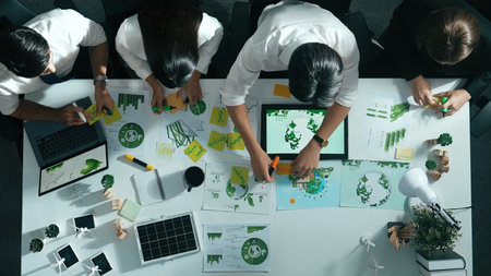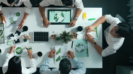 Diverse group of business people planning business marketing with environmental responsibility for greener ecology. Productive teamwork contribute natural preservation and sustainable future. Quaint