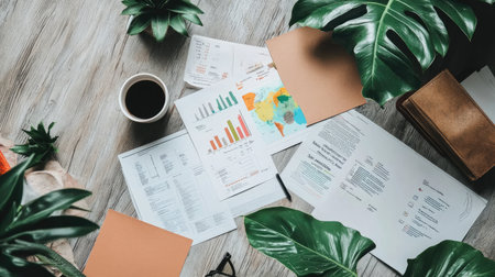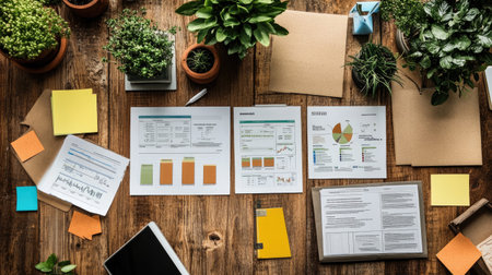 A vibrant workspace scene featuring financial documents, a coffee cup, and lush green plants on a rustic wooden table, perfect for showcasing productivity and organization.