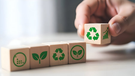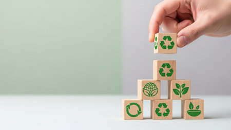 This image showcases a collection of wooden cubes arranged to symbolize environmental sustainability and renewable energy sources. The composition features various icons, including recycling symbols and lightning bolts, set against a blurred background. The style suggests a modern, graphic design, suitable for illustrations related to eco-conscious topics and commercial projects.