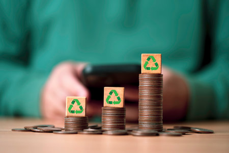Creative arrangement of green leaves and coins showcasing sustainable living and recycling concept in an artistic display. Generative AI