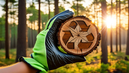 Sustainable resources and zero waste concept. Gloved hand holding a cross section of a tree trunk with a wooden recycle symbol with a green forest on background. Generative Ai.