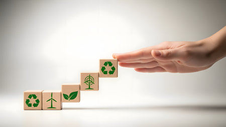 A hand reaches for a wooden block with a recycling symbol, representing progress towards sustainability.
