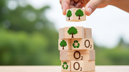 A hand places a wooden block with a tree icon on top of a stack. The composition features various blocks, some displaying trees and others, the symbols for oxygen and recycling. The shot has a shallow depth of field, with soft natural lighting and a green background. Suitable for environmental or educational themes.