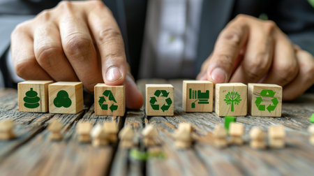 Hand placing a wooden cube with green recycling and growth symbols, illustrating sustainable business development and environmental protection goals.