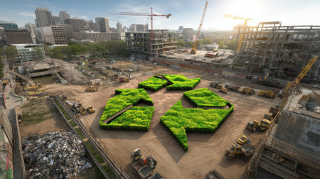 A vibrant green recycling symbol made from plants sits in the center of a bustling construction site, showcasing urban development and sustainability.