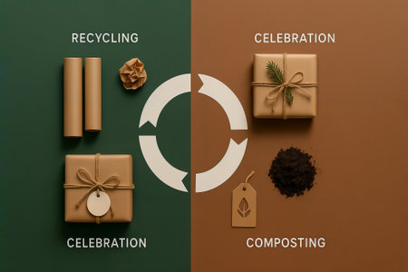 A flat lay composition showing holiday gifts, recycling symbols, and organic compost.