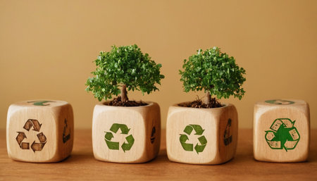 Wooden blocks with eco-friendly symbols and small plants growing, representing sustainable growth, recycling, and environmental conservation.