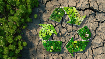 A visually striking image featuring a mosaic recycling symbol made from green tiles, set against a cracked earth background, illustrating the theme of environmental awareness.