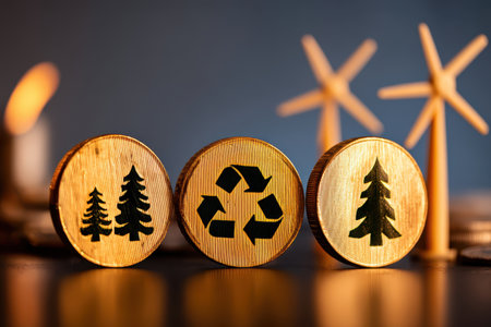 This image showcases golden coins featuring renewable energy symbols, emphasizing sustainability and eco-consciousness in finance and nature.