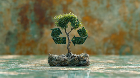 A miniature tree crafted from lush greenery sits atop textured soil, coupled with recycle symbols. This image embodies the concepts of sustainability and environmental consciousness.