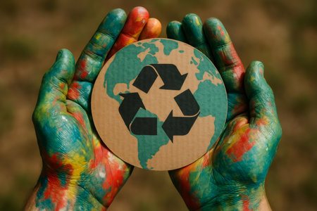 Colorful painted hands holding a cardboard cutout of Earth with a recycle symbol, symbolizing environmental protection and sustainable practices