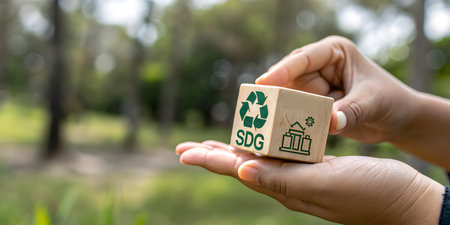 The image depicts a hand stacking wooden blocks featuring various eco-friendly symbols, such as recycling signs and a globe, on a transparent background. This image is suitable for environmental and sustainability themes.
