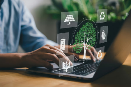 Close-up of hands typing on a laptop keyboard, overlaid with holographic icons representing solar power, recycling, and environmental conservation, highlighting digital engagement with eco-friendly initiatives.