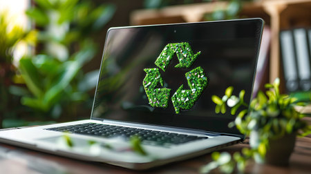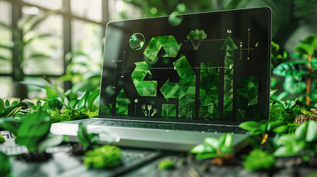 A laptop screen displaying a green recycling symbol, surrounded by lush plants, promoting eco-friendly technology.