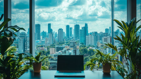 A contemporary workspace featuring a laptop and potted plants, overlooking a vibrant city skyline through large windows. Ideal for promoting modern office designs.
