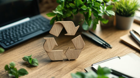 A stylish wooden recycling symbol stands on a modern desk adorned with greenery, a keyboard, and stationery, showcasing a blend of eco-friendliness and contemporary design.