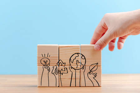 Save planet concept, circular economy, recycle, environment, reuse, manufacturing, waste, consumer, resource, mens hand put wooden cubes onthe table on blue background