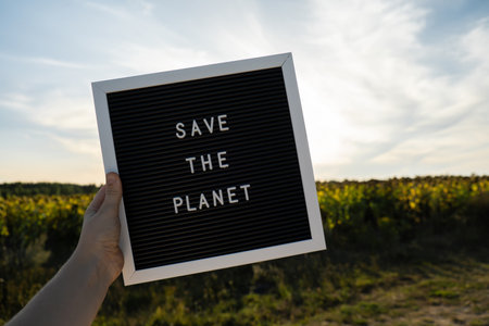 Unrecognizable person with banner message SAVE THE PLANET in sunflower field on sunny day. Sign EARTH day. Concept of ecology and eco activism environmental issues Stop global warming. Go green