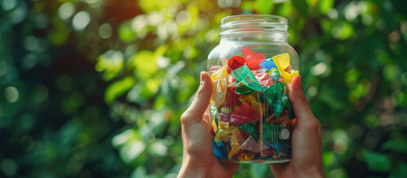 Generative AI, close up of hands holding a glass jar filled with colorful recycled materials, such as paper, plastic and glass