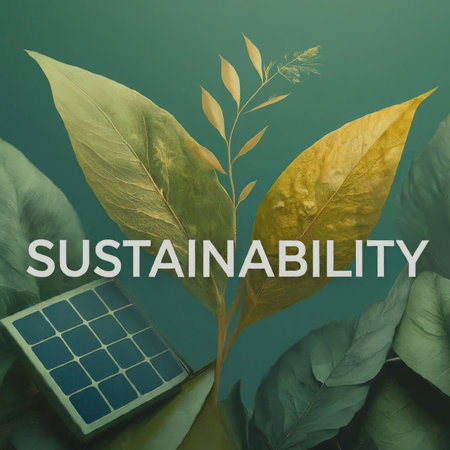 The image features the word 'Sustainable' surrounded by vibrant green leaves covered with raindrops, reflecting an eco-friendly and environmentally conscious theme.