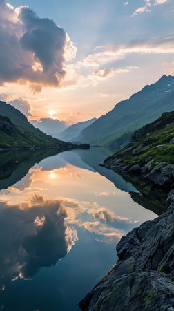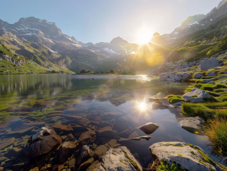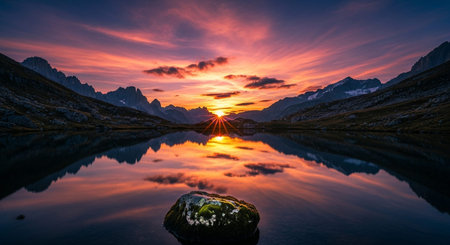 Tranquil sunset scene in the mountains. Serene lake reflects the sun setting behind the rocky peaks. A warm and picturesque glow