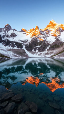 Majestic mountain range reflection in pristine alpine lake at sunrise