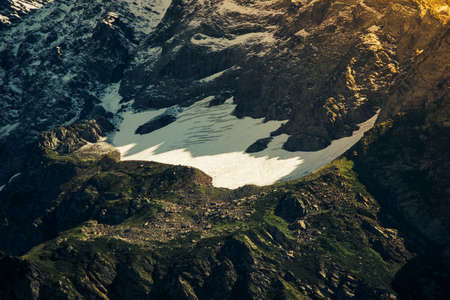 Sunset light over retiring dying glaciers on the Italian French Alps. Climate change concept. Toned desaturated image.