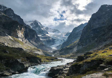 Swiss alpine mountain glacier melt river near Susten pass at sunset, Switzerland