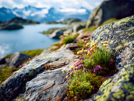 A burst of colorful blossoms carpets rugged stones near a calm mountain pond, creating a lively contrast between delicate flora and rugged natural textures.