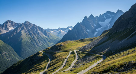 A winding asphalt road with multiple sharp turns ascends a steep, grassy mountain slope under a clear blue sky, leading towards rugged, snow-capped...