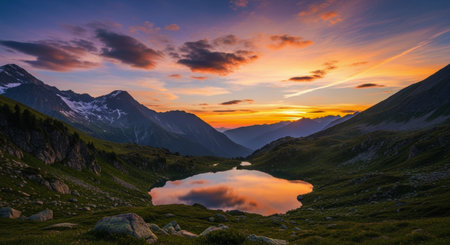 Serene mountain landscape at sunset with a tranquil lake reflecting the vibrant golden and purple sky. snow capped peaks and green slopes surround the calm water.