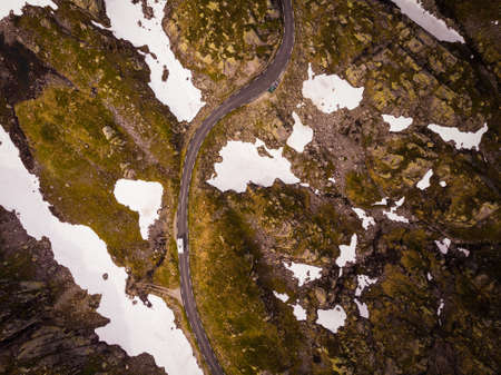 Aerial view. Norway landscape. Road with camper cars in stony rocks mountains. Norwegian national tourist scenic route Ryfylke.