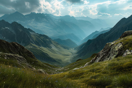 A breathtaking view of a serene mountain landscape showcasing lush green valleys and bright white wildflowers, inviting exploration and appreciation of nature's beauty.