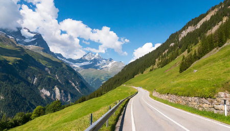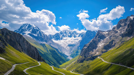 A serpentine road twists through vibrant green hills, leading to majestic mountain peaks in a picturesque alpine setting bathed in sunlight and dotted with fluffy clouds.