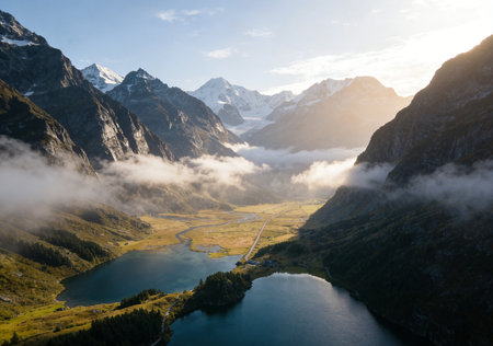 Serene Alps landscape mountains valley. Sky tourism. Generate Ai