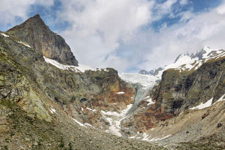 View of mountain peaks with glaciers in Val Ferret, Aosta valley, Italian alps