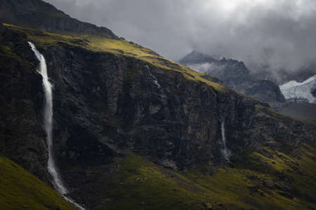 Waterfall in a valley between mountains in the french alps