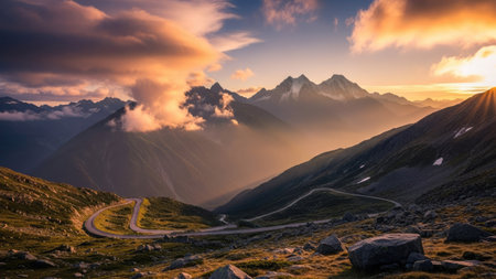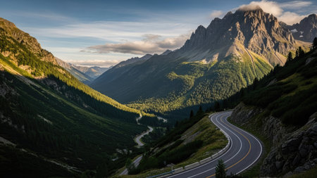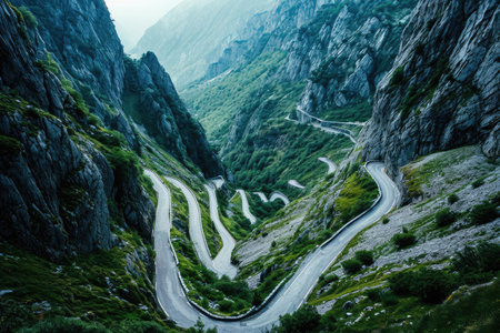 Mountain showing winding mountain road with sharp turns and steep slopes surrounded by lush green valleys and rocky peaks keywords: mountain road,...