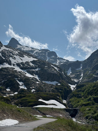 Sustenppass, Switzerland - August 13, 2021: The Susten Pass (2224 m high) connects the Canton of Uri with the Canton of Bern. The pass road is 45 km long and is one of the newer ones in the Swiss Alps.