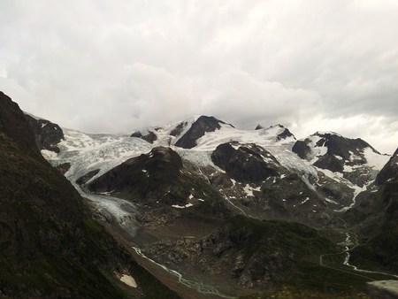A mountain range in the Swiss Alps with snow and ice on the top. The mountains are covered in green grass. The sky is cloudy and gray