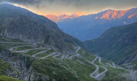Old road with tight serpentines on the southern side of the St. Gotthard pass bridging swiss alps at sunset