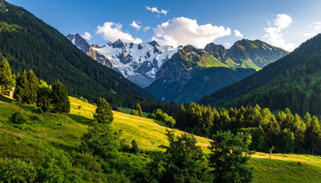 Mountain landscape with green meadow and snow-capped peaks