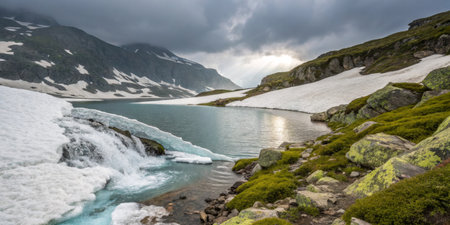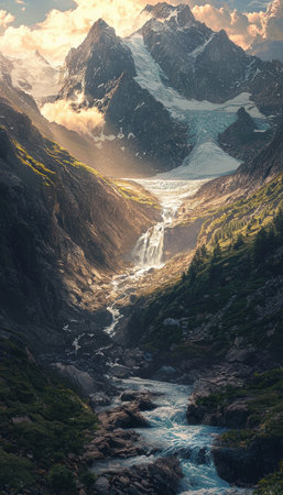 Glacier Melting Under Sunlight: A Stunning Mountain Landscape Depicting Natures Balance