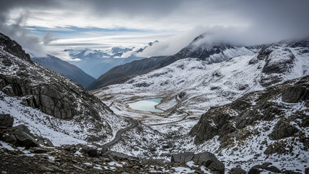 A winding grey road snakes through a rocky, snow-dusted mountain landscape towards a tranquil turquoise lake. Overcast skies and distant misty peaks create a dramatic, atmospheric scene.